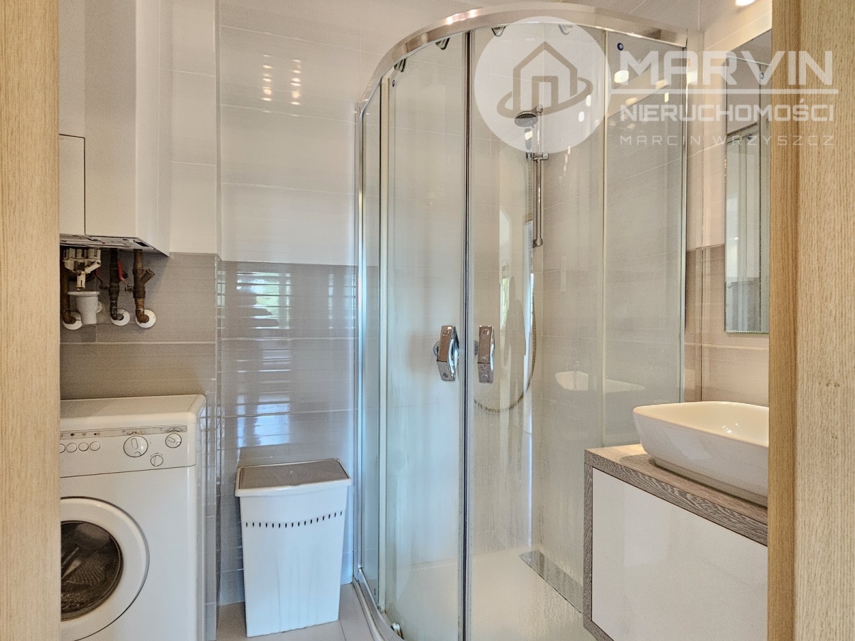 Łazienka – z kabiną prysznicową, umywalką, pralką, szafką, lustrem i WC.