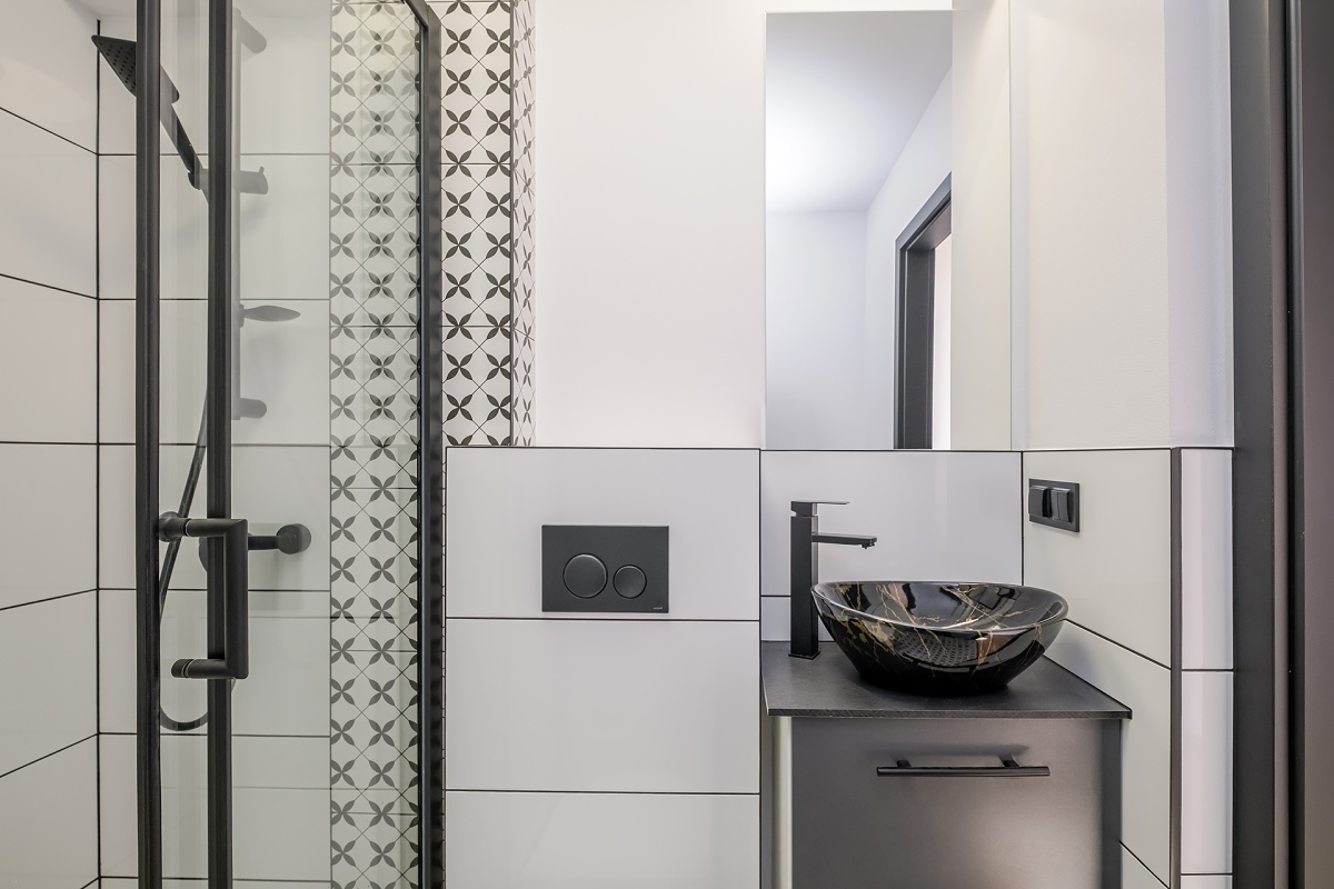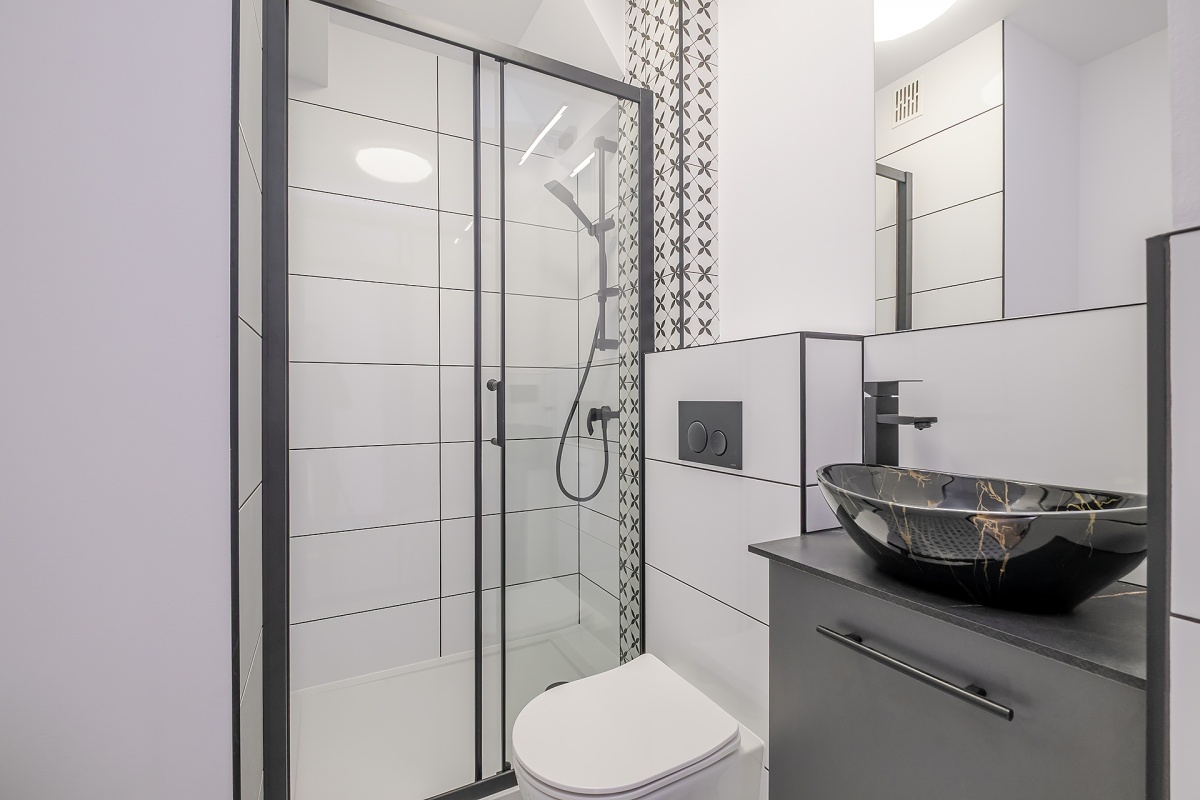 – wykończonej łazienki z kabiną prysznicową oraz wnęką z wyprowadzeniami na pralkę z suszarką