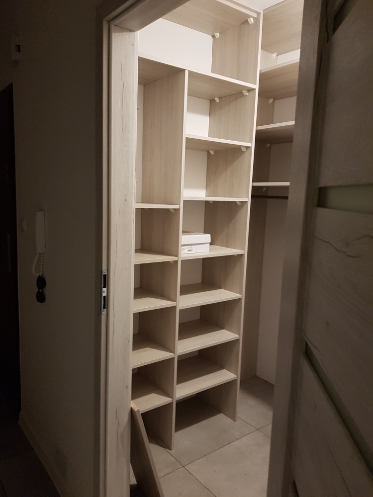 w garderobie zabudowa z półkami i szafkami (również stolarska),