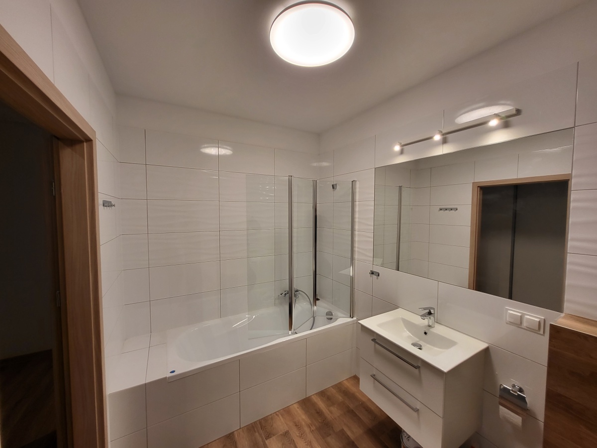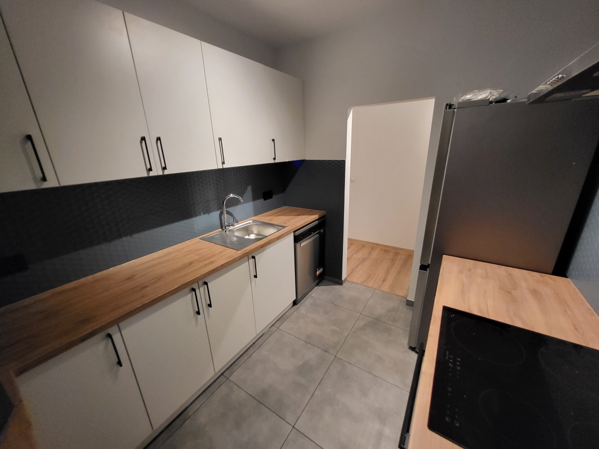 – Kuchnia: lodówka, płyta indukcyjna, piekarnik, okap, zmywarka, płytki ceramiczne na podłodze i ścianach