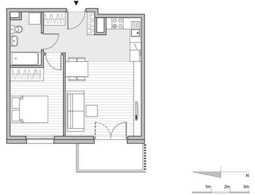 Struktura apartamentu: salon z aneksem kuchennym i wyjściem na prywatny taras, przedpokój, łazienka z kabiną prysznicową.