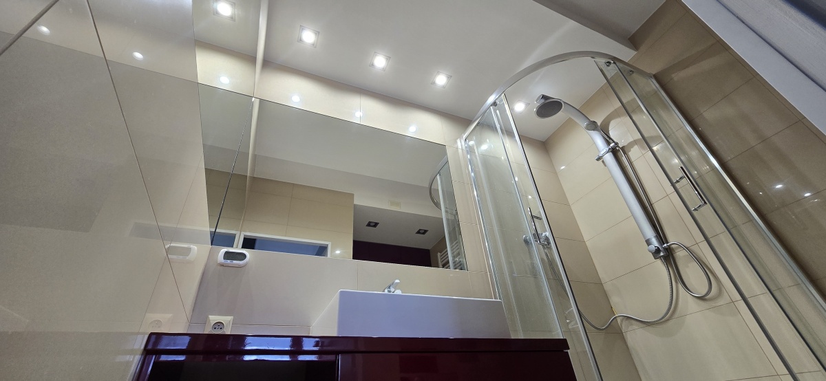 Duża łazienka z dwiema taflami luster, meble lakierowane wc podtynkowe, gres na ścianach i podłodze.