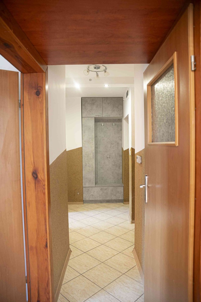 -przedpokój z szafą na ubrania i buty, doskonale komunikujący wszystkie pomieszczenia.