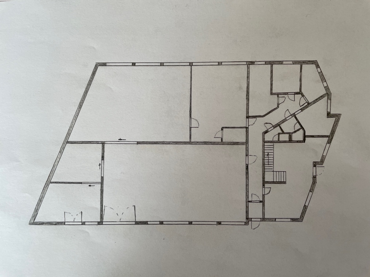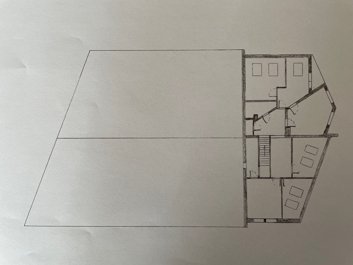 Tył (parter) – ciąg dwóch hal o wysokościach 4 m (środek) i 3 m (ściany), z oknami i skośnym sufitem – idealne na produkcję.