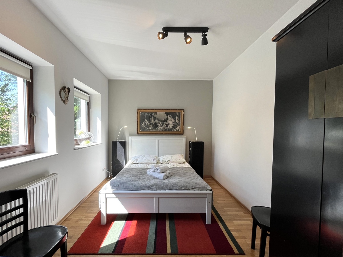 Klasyczne schody prowadzą na górne PIĘTRO z wysokimi pokojami. Tutaj samodzielne dwa pokoje/sypialnie (obie 21 m.kw); open space z kanapą (19,64 m.kw); pokój kąpielowy (duża łazienka z wanną i toaletą) (6,45 m.kw); garderoba z pralnią (5,86 m.kw).