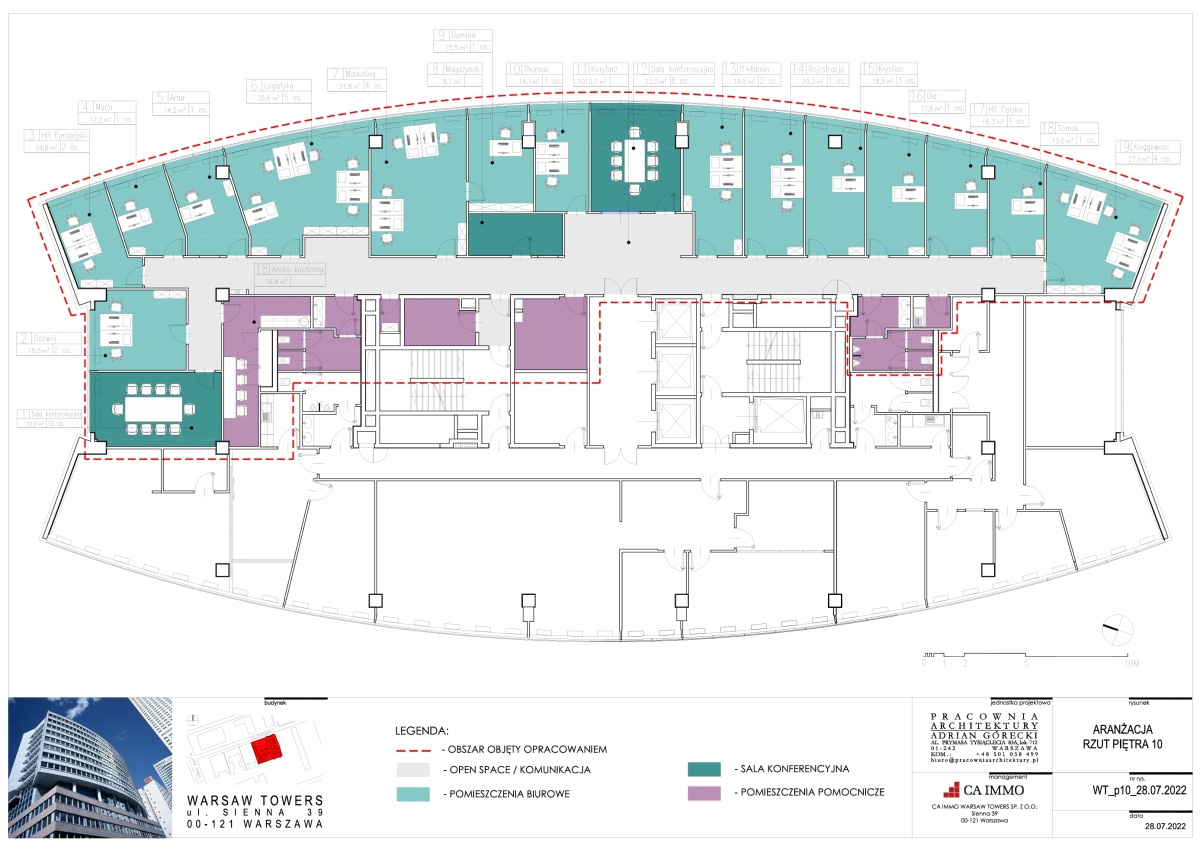 Biuro do podnajęcia w budynku Warsaw Towers (Sienna 39, 00-121 Warszawa). Bliskie sąsiedztwo Pałacu Kultury i Nauki, dworca Warszawa Centralna, Złotych Tarasów oraz hotelu InterContinental.