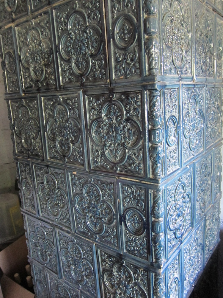 Piece kaflowe: w izbie niebieskie kafle z kamienicy z Krakowa, w kuchni piec kaflowy kuchenny z płytą, piekarnikiem i piecem chlebowym, wszystko sprawne.