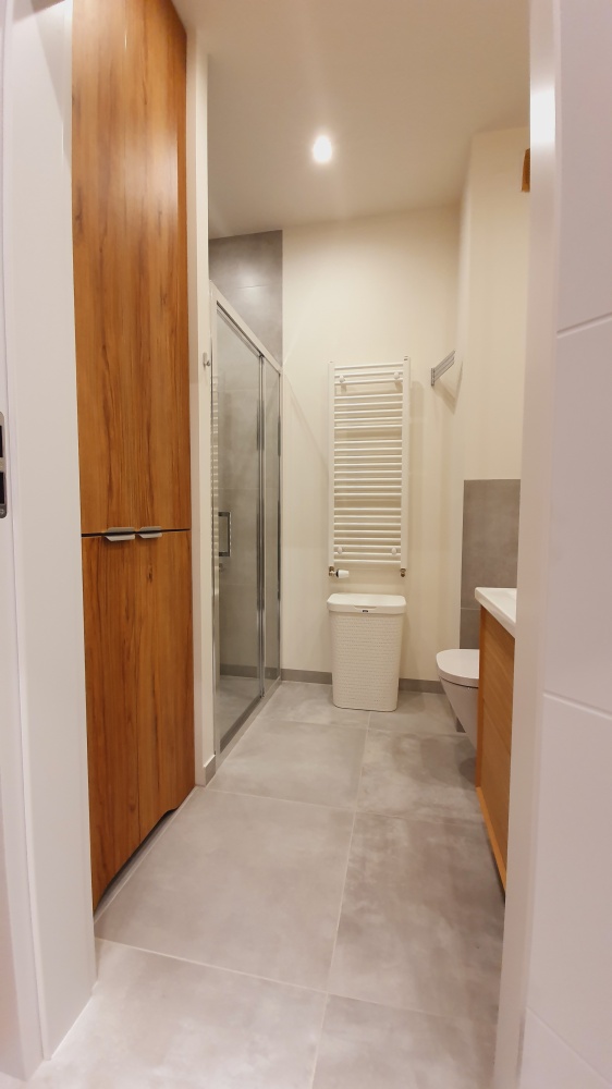 Łazienka połączona jest z toaletą. Wysokiej jakości armatura, ceramika, stolarka drzwiowa PORTA, duża kabina prysznicowa, pojemna zabudowa meblowa to gwarancja komfortu.