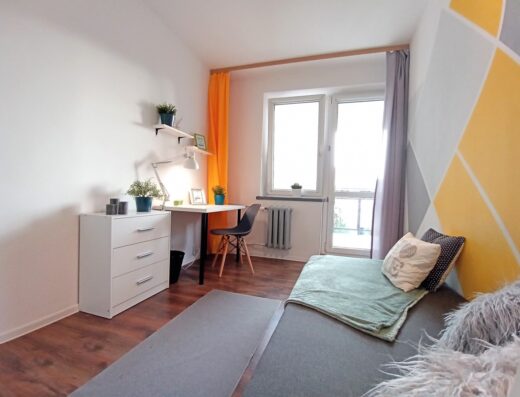 Sypialnia duża ma prawie 17,5 m2. Ta cicha i spokojna przestrzeń zapewnia komfort wypoczynku. Duże okna na prawie całej długości ściany dają doświetlenie i poczucie przestrzeni. Duża sypialnia to ogromny atut tego mieszkania. Można w niej stworzyć naprawdę pokaźną, dobrze zorganizowaną przestrzeń na garderobę . Obecne umeblowanie sypialni stanowi łóżko szerokości 160 cm wraz ze stolikami nocnymi oraz duża liczba tradycyjnych szaf w zabudowie wnękowej.