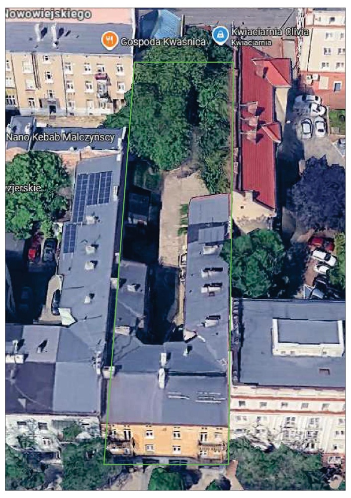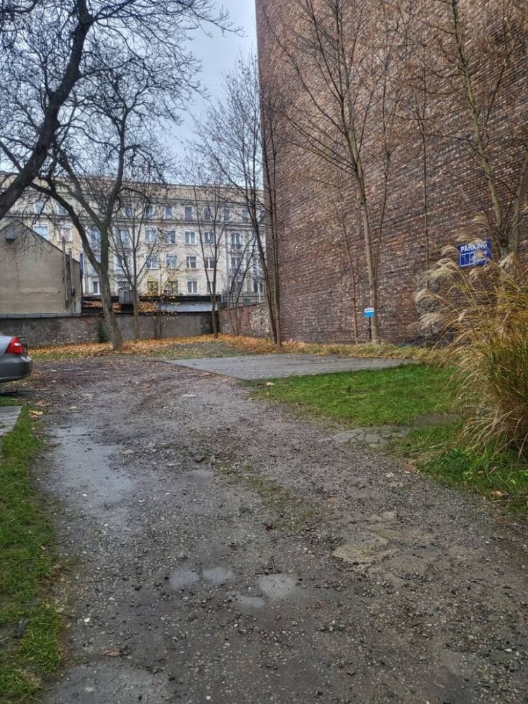 Wjazd od ulicy Śląskiej. W podwórzu miejsca parkingowe.