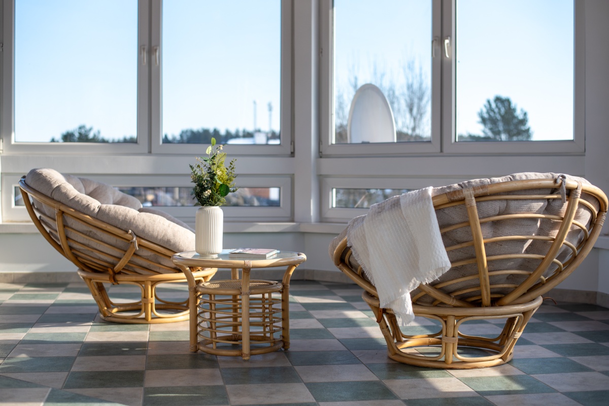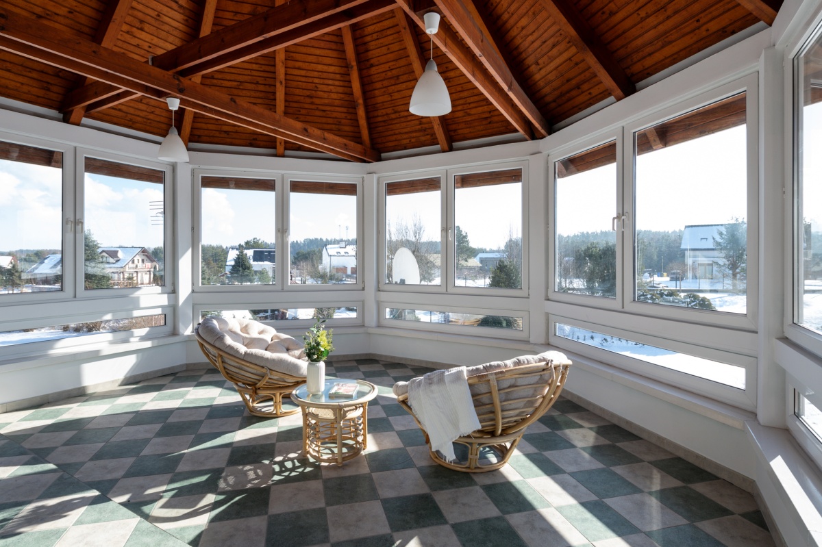 Zadaszony, przeszklony taras/weranda z widokiem na ogród i okolicę