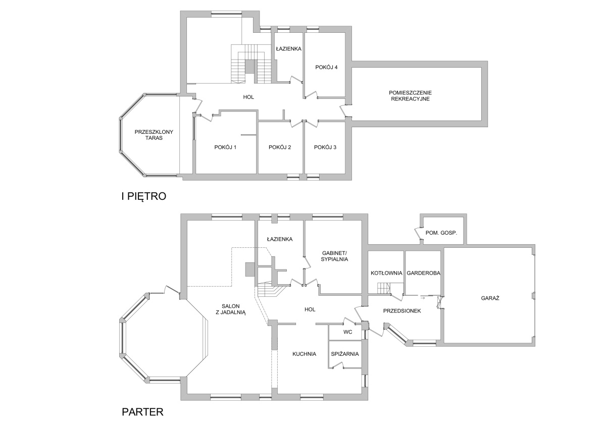 Obszerny i doskonale oświetlony przedsionek z dużymi oknami i garderobą przesłoniętą drzwiami przesuwnymi może zostać zaadaptowany na gabinet lekarski, kosmetyczny lub psychologiczny. Część ta jest oddzielona od domu drzwiami, za którymi znajduje się hol.