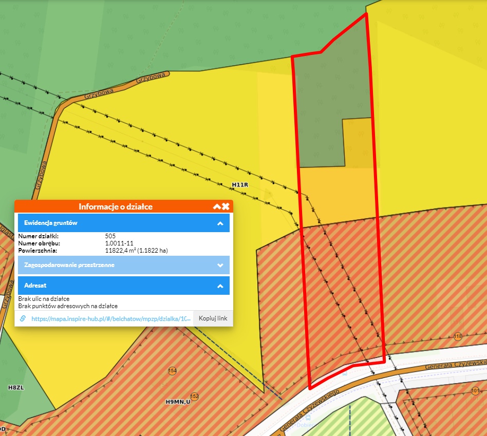 Sprzedam działkę z dużym potencjałem położoną w Bełchatowie przy ulicy Czyżewskiego, nr ewid. 505/11, zgodnie z MPZP ma charakter budowlano-rolno-leśny. Jej całkowita powierzchnia wynosi 11800 m2, z czego 5000 m2 – pow. budowlana, 2500 m2 – pow. rolna, 3500 m2 – pow. leśna.