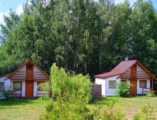 Po jednej stronie stawu znajduje się opisany wyżej dom mieszkalny wraz z garażami, a po drugiej stronie stoją dwa domki caloroczne o powierzchni zabudowy 35m² każdy, obydwa wybudowane w 2023. Powierzchnia po podłodze każdego domku wynosi ok 40m². Są to dwa identyczne domki, murowane i ocieplone z antresolą, wykończone w wysokim standardzie. Kazdy z domków: salon z aneksem kuchennym, łazienka, sypialnia + druga sypialnia na antresoli.