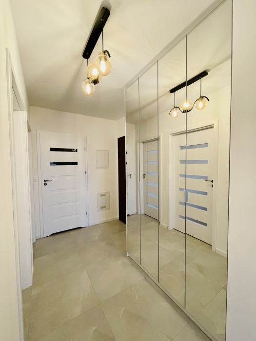 – przedpokoju (domofon, podwójna szafa w zabudowie z lustrem),