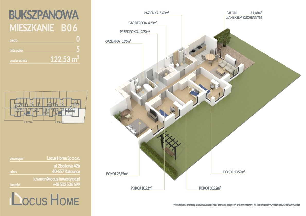 Przedstawiamy ofertę mieszkania 5 – pokojowego Z OGRZEWANIEM PODŁOGOWYM o powierzchni 122,53 m² z OGRÓDKIEM 269m², zlokalizowanego na parterze budynku, oznaczonego nr B 0.6