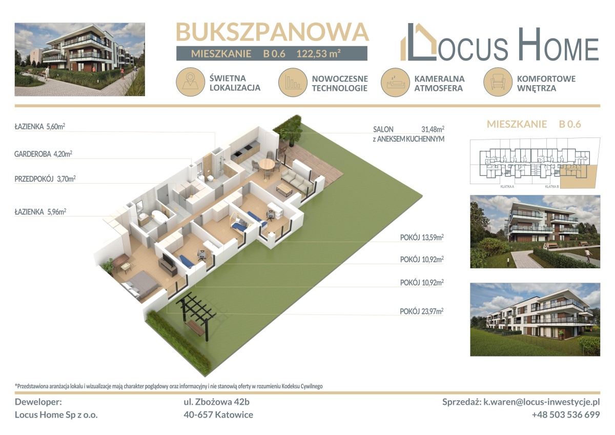 Spółka LOCUS HOME to DEWELOPER który realizuje inwestycje mieszkaniowe na terenie Katowic od wielu lat. NOWA inwestycja na ulicy BUKSZPANOWEJ (obok nr 19) w Piotrowicach to nowoczesny apartamentowiec w doskonałej lokalizacji Katowic.
