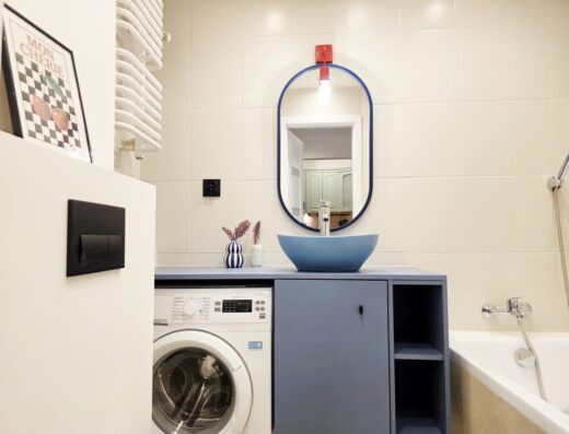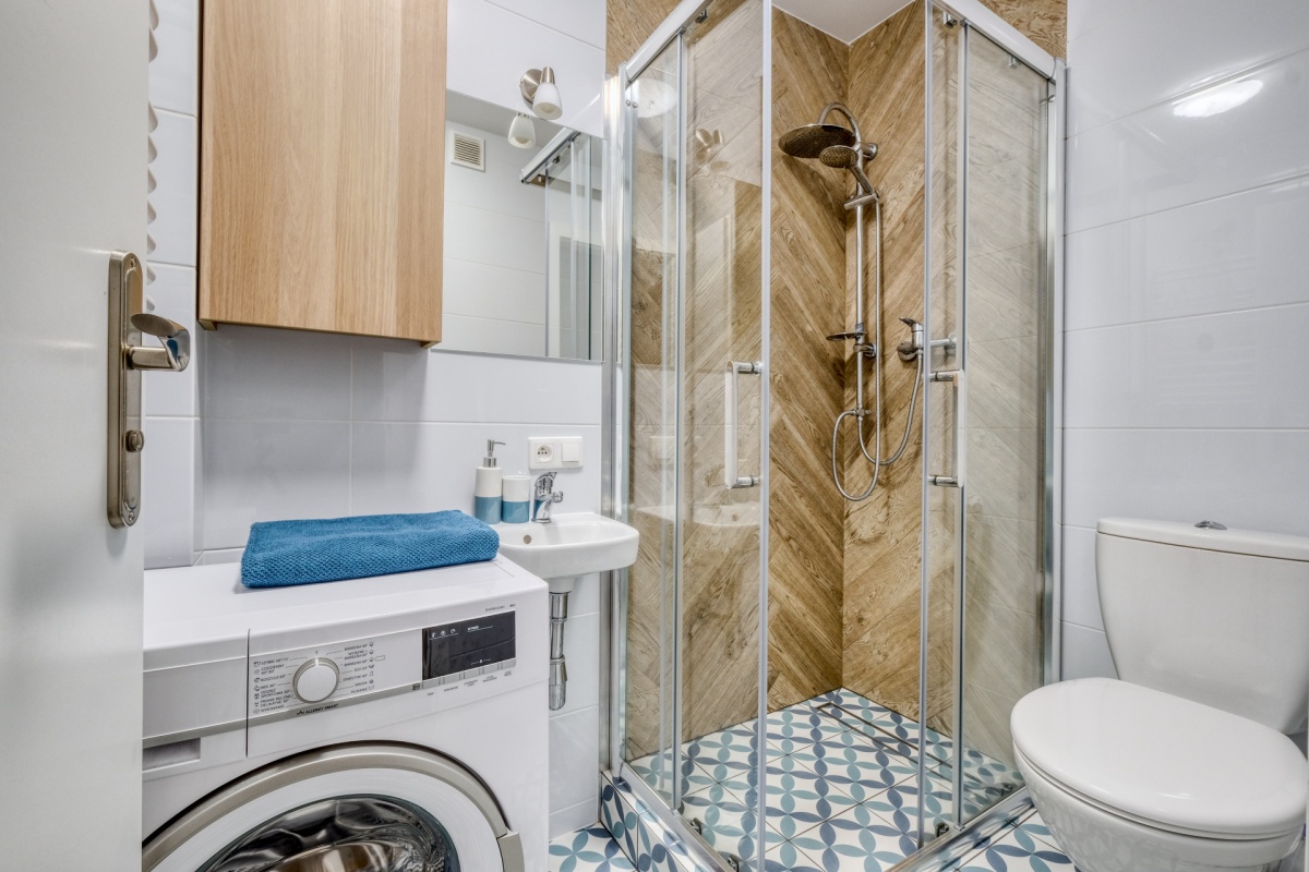 – – – – – pełna łazienka, a w niej: prysznic, WC, umywalka, pralka