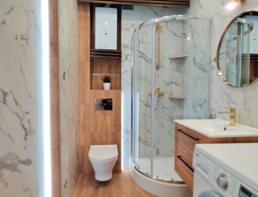 – łazienka z wanną/prysznicem, pralką i piecem gazowym dwufunkcyjnym;