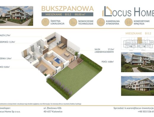 Spółka LOCUS HOME to DEWELOPER który realizuje inwestycje mieszkaniowe na terenie Katowic od wielu lat. NOWA inwestycja na ulicy BUKSZPANOWEJ (obok nr 19) w Piotrowicach to nowoczesny apartamentowiec w doskonałej lokalizacji Katowic.