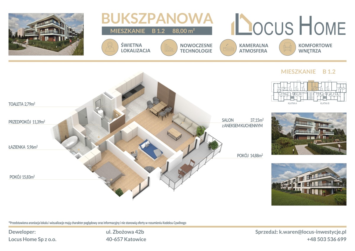 Spółka LOCUS HOME to DEWELOPER który realizuje inwestycje mieszkaniowe na terenie Katowic od wielu lat. NOWA inwestycja na ulicy BUKSZPANOWEJ (obok nr 19) w Piotrowicach to nowoczesny apartamentowiec w doskonałej lokalizacji Katowic.