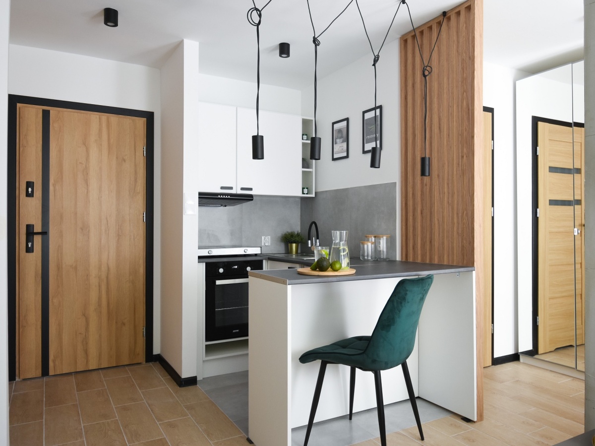 kuchnia lekko oddzielona funkcjonalnym blatem — pełni rolę zarówno roboczego blatu, jak i stołu jadalnego.