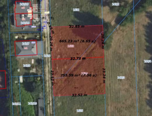 Działka jest w kształcie prostokąta o powierzchni 5301 m2, wymiary: szerokość ok 47 mb x głębokość ok 113 mb