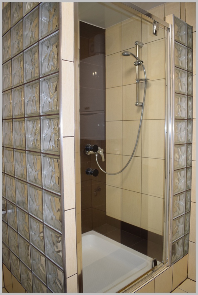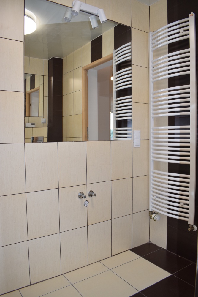 * Łazienka: wyposażenie- prysznic, na podłodze – płytki,