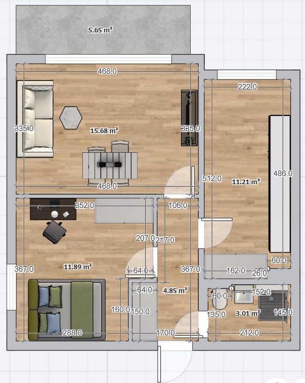 nowe meble na wymiar (zabudowa kuchenna, szafa wnękowa w korytarzu, szafa w sypialni, szafka rtv w salonie)
