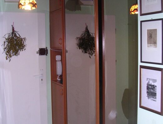 W przedpokoju obszerna szafa garderobiana na garderobę i buty oraz pawlacz nad drzwiami wejściowymi.