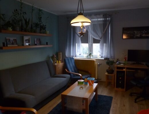 W pokoju dziennym rozkładany narożnik, stolik kawowy, nowoczesne meble z miejscem do pracy (biurko zostanie zmontowane jeśli jest potrzebne), aby optymalnie wykorzystać powierzchnię.