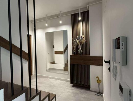 Budowa w latach 2008-2009. Ściany z pustaka ceramicznego 25 cm, strop wylewany Teriva, ocieplenie styropianem 15 cm, dachówka ceramiczna Jungmeier, okna drewniane, na parterze do podłogi co daje niesamowity efekt wizualny. Na parterze na podłogach deska merbau, na półpiętrze i na piętrze parkiet merbau. W przedsionku, kuchni i łazienkach stylowa terakota.