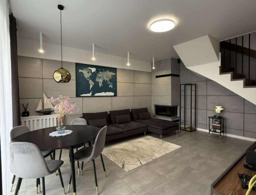 Parter: powierzchnia około 125 m²: przedsionek z ładną i funkcjonalną szafą i przejściem do garażu, toaleta gościnna, gabinet/sypialnia, nowy aneks kuchenny (w pełni wyposażony) z wykuszem i spiżarnią, jadalnia, salon z kominkiem z płaszczem wodnym (dodatkowe źródło ogrzewania c.o. i c.w.u.).