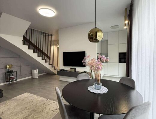 Dom wolnostojący, przestronny, komfortowy, położony w spokojnej części Łomianek Dolnych, przy ul. Karola Szymanowskiego 30. To moja ocena, więc może subiektywna, ale dom jest przepiękny, w stylu śródziemnomorskim. Układ pomieszczeń jest bardzo funkcjonalny. Całe wnętrze odnowione, całkiem nowa kuchnia. Od remontu nikt nie mieszkał więc można powiedzieć, że wnętrze prawie jak nowe. Gotowy do zamieszkania. Powierzchnia mieszkalna około 295 m², całkowita z garażem około 330 m². Foremna działka w kształcie prostokąta o powierzchni 1211 m². W ogrodzie piękne, dojrzałe rośliny, ukazujące swój urok w sezonie wiosenno-letnim, dające dużo intymności. Automatyczne podlewanie ogrodu. Garaż na dwa auta. Dojazd drogą asfaltową, wszystkie media. Dom idealny dla kogoś kto lubi przestrzeń, dla rodziny, do pracy zdalnej. W sumie 7 pokojów, otwarty salon z jadalnią i aneksem kuchennym, pralnia, miejsce na siłownię i saunę, garderoba przy sypialni głównej, dwie łazienki na piętrze, toaleta na parterze, poddasze użytkowe. Cicha okolica, dobry dojazd do Warszawy.