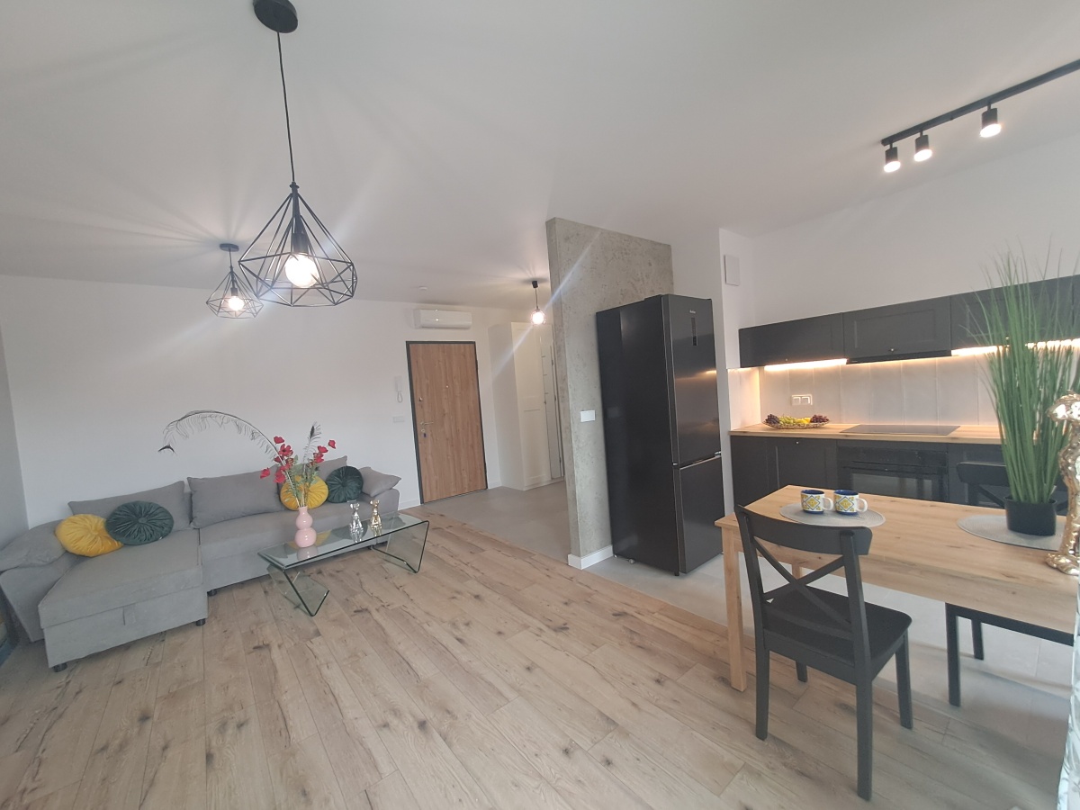 -jasny salon z kuchnią wyposażoną w AGD i z wyjściem na balkon