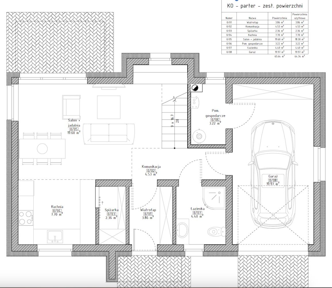 Garaż w bryle budynku: 19,97 m² – idealne miejsce na samochód i dodatkowe przechowywanie.