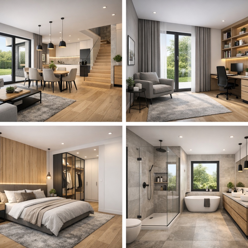 Funkcjonalny układ pomieszczeń: Przestronny salon z jadalnią, jasna kuchnia, spiżarnia, 4 sypialnie, 2 łazienki, garderoba i pomieszczenie gospodarcze – wszystko zaprojektowane z myślą o komforcie rodziny.