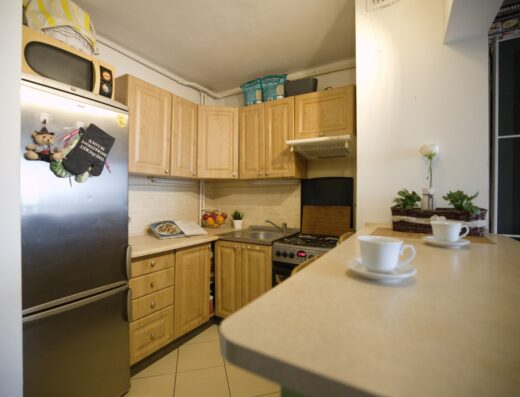 Kuchnia jasna, funkcjonalna i w zabudowie.