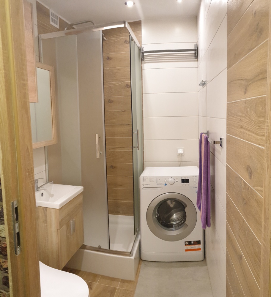 Łazienka oryginalnie doświetlona i nowocześnie doposażona we wszystkie niezbędne urządzenia łazienkowe i sanitarne. Także podręczna suszarka na codzienne pranie.