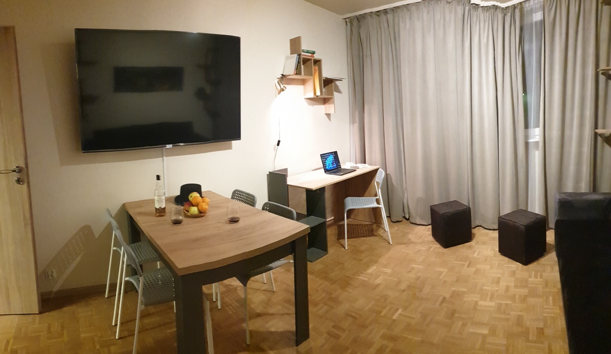 W dużym pokoju telewizor 65 cali, rozkładana sofa z możliwością spania, rozkładany stół jadalny dla 6 osób i 2 pufy oraz ława kawowa.