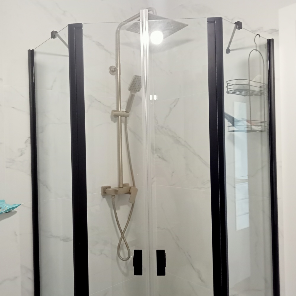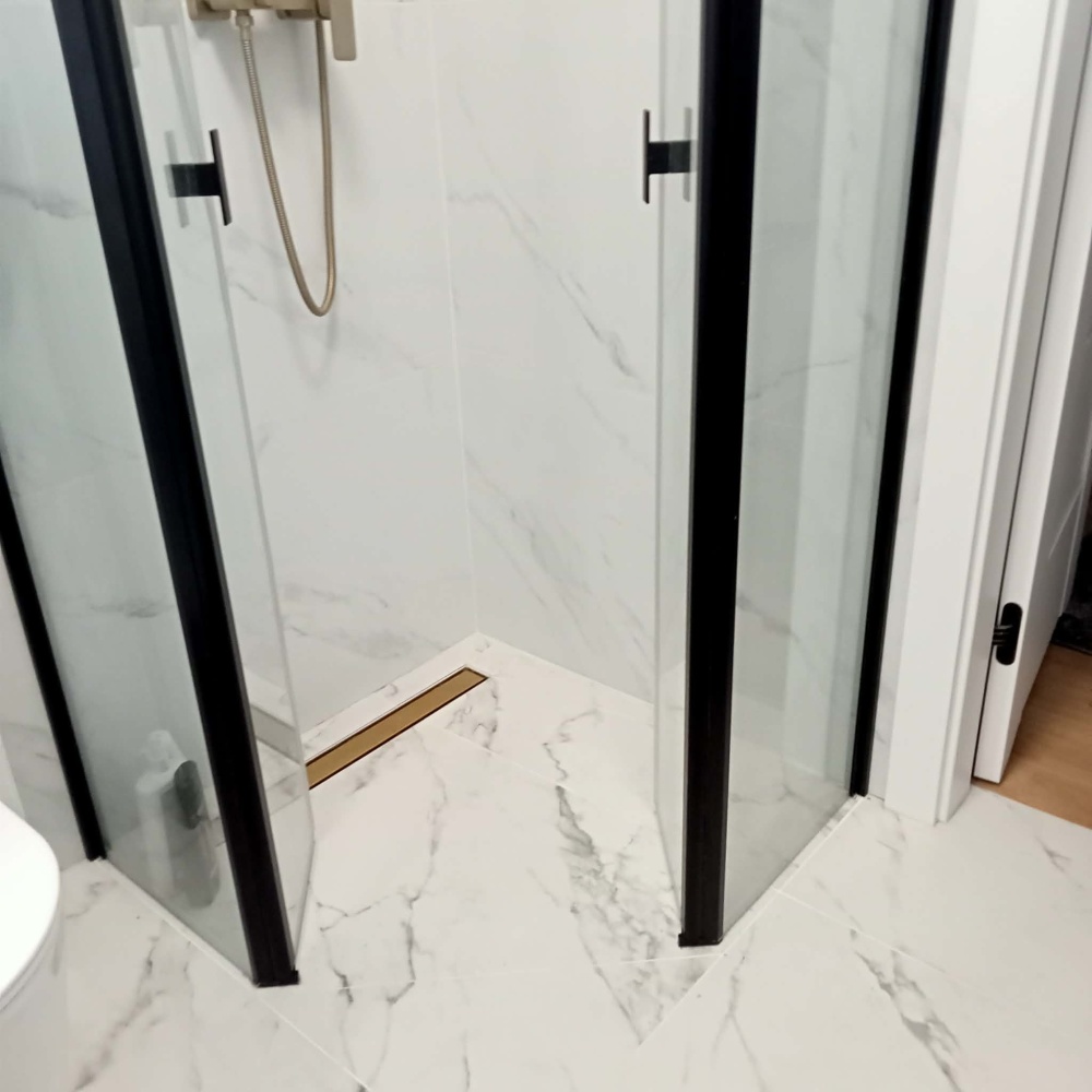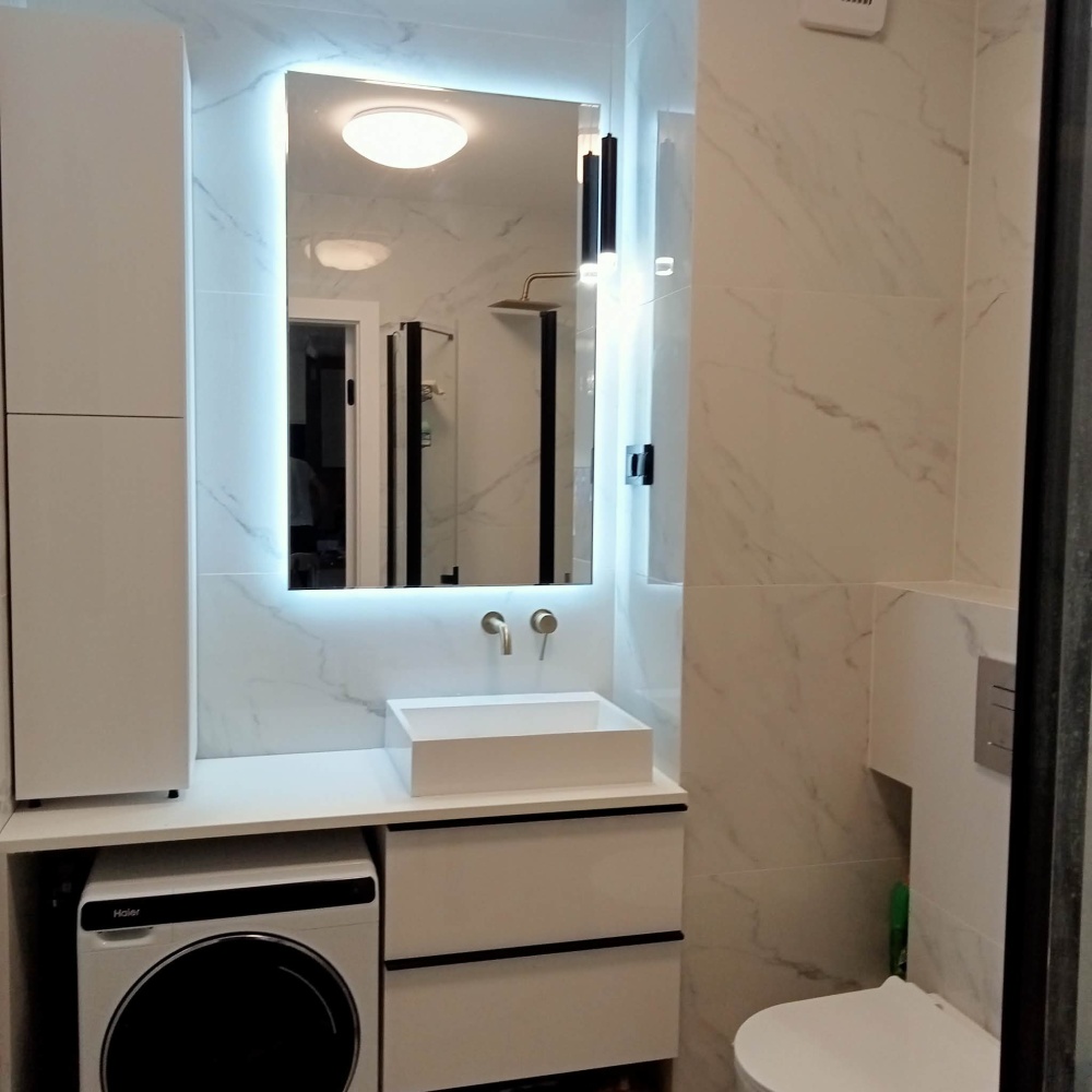 * łazienka z prysznicem walk in, pralka .